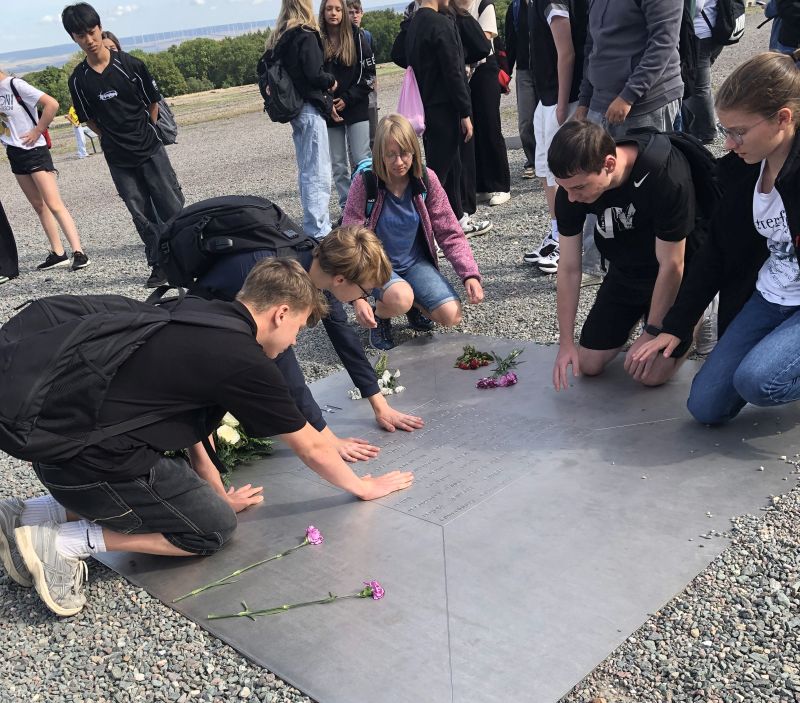 In der Gedenkstätte Buchenwald legten die Jugendlichen ein Gesteck an der Gedenkplatte nieder. Interessant war sicher auch die Berührung der Platte die im Inneren immer auf 36,5°C erwärmt wird. Durch die beiden mitgereisten Herren erhielten die Klassen eine Führung über das Gelände und vertieften ihr Wissen.