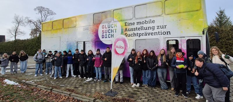 Am vergangenen Freitag erlebten die Schülerinnen und Schüler der Klassenstufe 7 einen besonderen Unterrichtstag: Der Glücksbus öffnete exklusiv für unsere Schule seine Türen in Königsbrück. Schon von außen beeindruckte der bunt gestaltete Doppeldecker, doch das eigentliche Erlebnis wartete im Inneren. Dort erwartete die Jugendlichen eine abwechslungsreiche Mischung aus interaktiven Stationen, Medienmodulen und Mitmachangeboten, die sich kreativ mit den Themen Glück, Identität, Konsumverhalten und Lebenskompetenz auseinandersetzen.