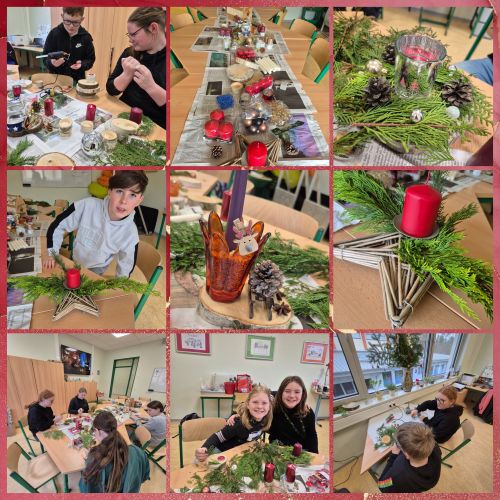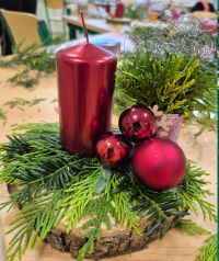 Aus verschiedensten Naturmaterialien konnten die Kinder liebevoll eigene Weihnachtsgestecke gestalten. Unsere Lehrkräfte hatten zuvor beim Vorweihnachtsputz ausgemistet – so standen uns auch viele tolle Dekomaterialien zur Verfügung. Ein besonderer Dank geht an Familie Jähnig sowie an Familie Globig für die großzügige Spende der Holzscheiben und Kerzenhalter. Dadurch wurde das Basteln für unsere Kinder noch kreativer und abwechslungsreicher.